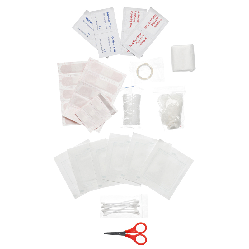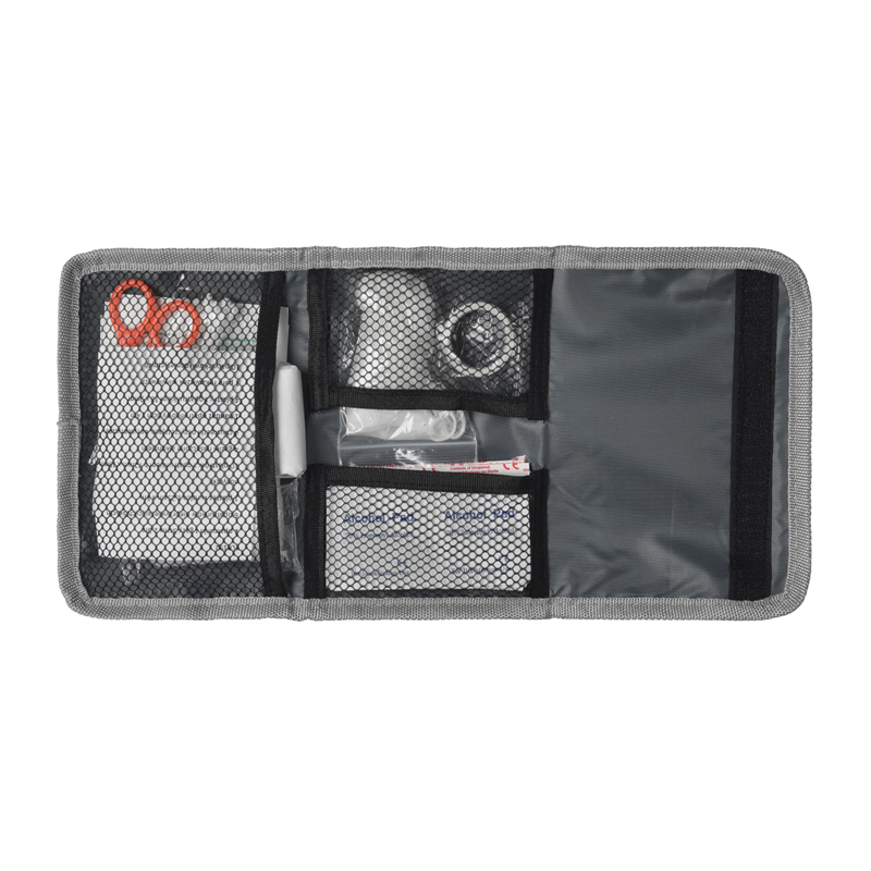 Erste-Hilfe-Set in meliertem grauem Wulong-Gewebe, bestehend aus folgenden Elementen: Schere, Latexhandschuhe, Pflaster, vier alkoholgetränkte Kompressen, zehn Wattestäbchen, zehn selbstklebende dehnbare Verbände 2 cm x 7,5 cm, 4 selbstklebende dehnbare Verbände 1 cm x 4 cm, 2 Rollen 5 cm Mullbinde, sechs sterile Kompressen 5x 5 cm, vier antiseptische Reinigungstücher, ein flexibles 4m x 6m klebender Gazerverband.